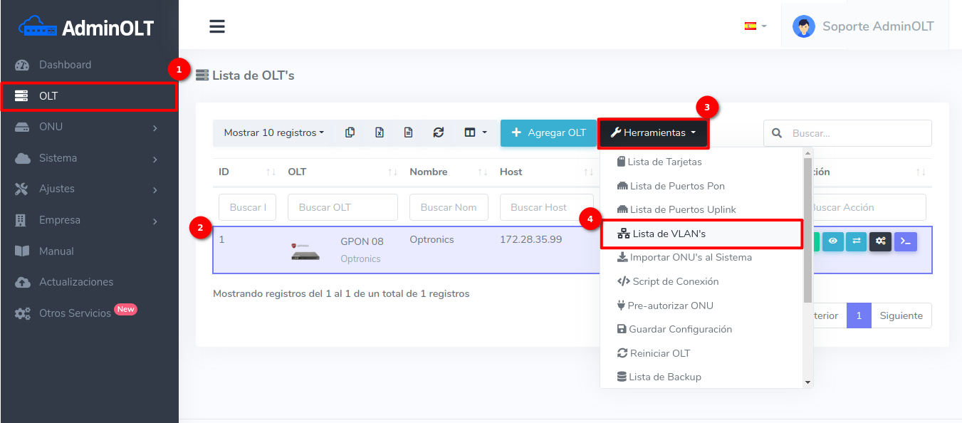2 Después de agregar esta vlan en tu router, podremos agregarla en la OLT desde la Lista de OLT's seleccionando la OLT y la opción Lista de VLAN's.